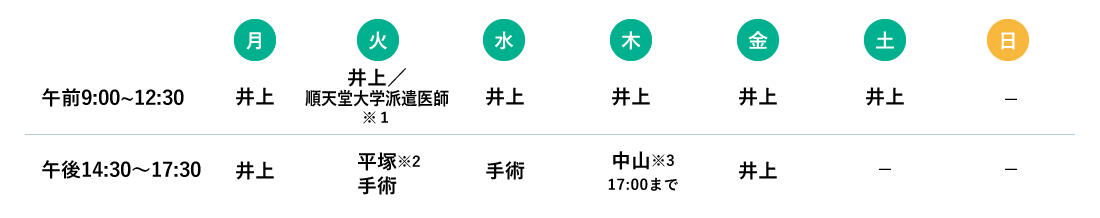診療時間:午前9:00~12:30、午後14:30~17:30(木曜日は17:00まで) 土曜日:午前9:00~12:30 休診日:土曜日午後、日曜日、祝日